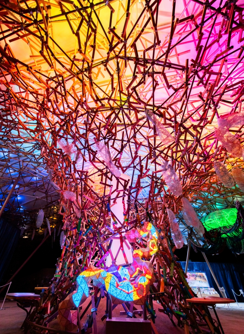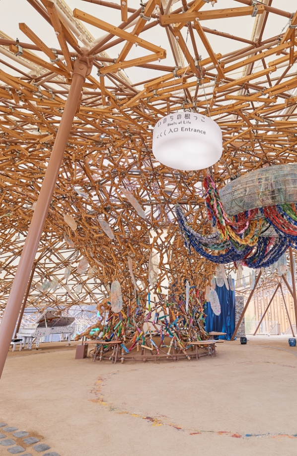 「創造の木」の木片は大屋根中に広がり、高度に計算され安全面などが担保されながら端の方はあえて強くは固定せず、ある程度の遊び(余裕)を持たせています。揺らぎを通じて、その場の人たちに繋がりを感じてもらえれば幸いです。