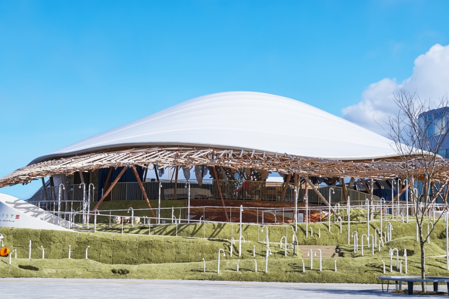 クラゲ館の象徴とも言える大屋根は半透明の膜でできていて、自然光を取り入れる一方、内部の温度を適切に保てる仕組みになっています。長さの違う何千本という鉄骨を三角形に組み合わせたトラス構造となっています。